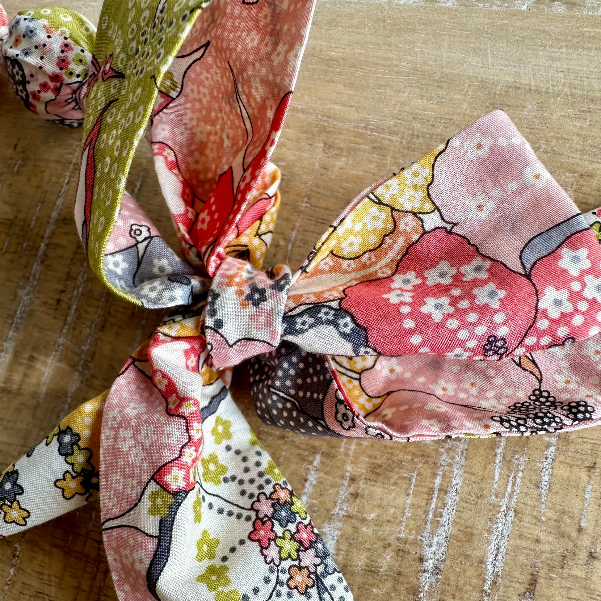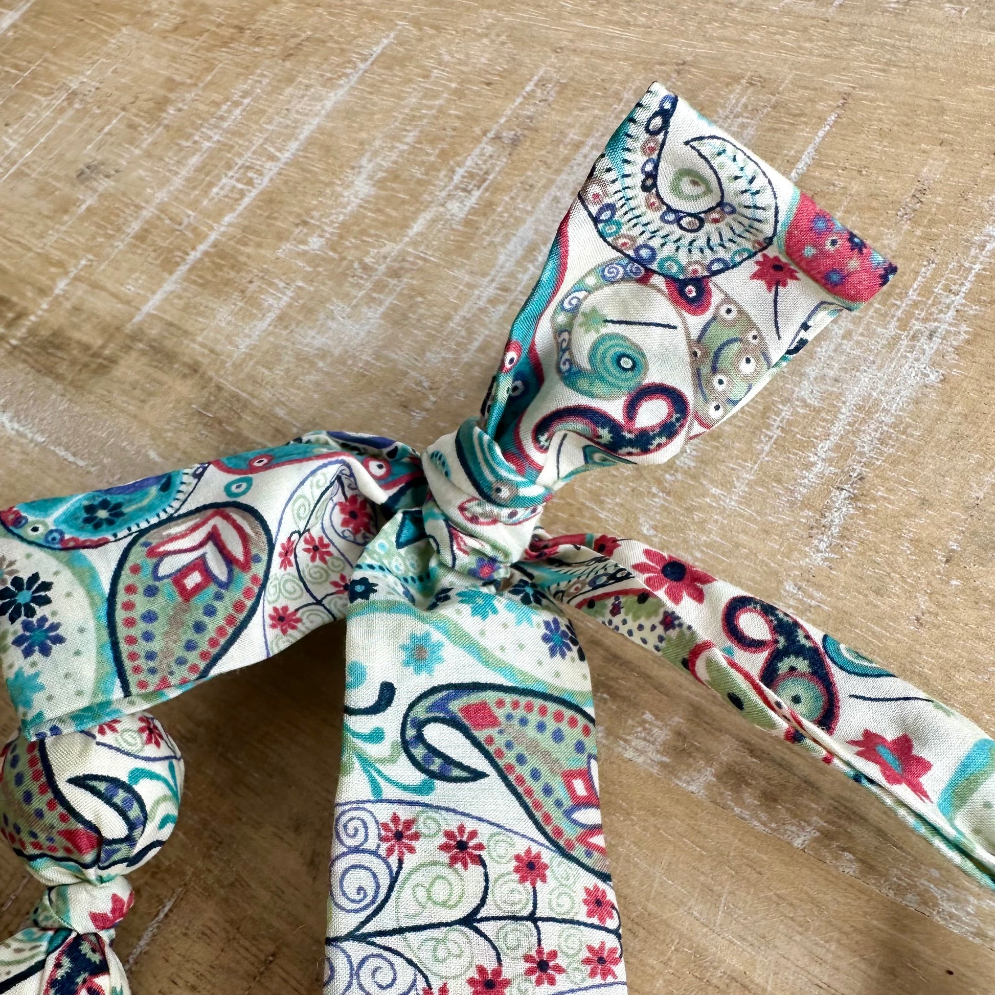 Réglable et léger, il se noue facilement autour du cou. Il peut également être porté en bracelet ou en bandeau dans les cheveux.